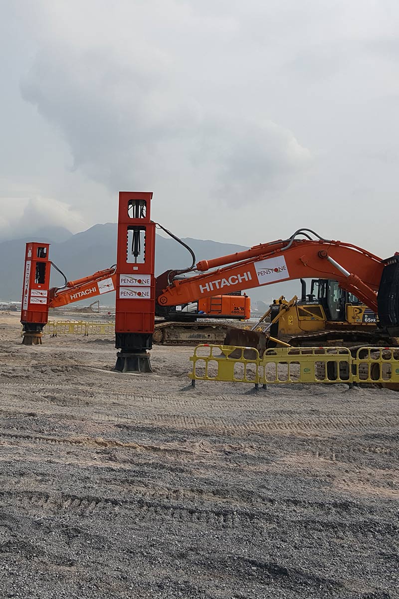 夯神VC-D系列多功能液壓振動夯實機為夯神液壓振動錘系列產品之一,是一種新型的高強度振動夯實機械。采用垂直振動壓實技術、高頻大振技術,主要零部件均為進口產品,激振力范圍60?600 kN。與振動壓路機、振動平板夯等現有產品普遍采用的圓振動技術相比,垂直振動壓實技術消除了圓振動的水平擾動力(破壞力),運行平穩、影響深度大、對鄰近結構物的影響小。